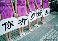 2007年6月9日,与往常一样的周末,闲来无事笔者到中关村海龙大厦淘宝,却意外捕获有趣的一幕:5名绝色MM,身着统一而优雅的长裙,构成海龙大厦前一道靓丽的风景,并造成大量行人的围观, 一度导致海龙门口交通堵塞. 更吸引眼球的是,5个美女各持一牌,上书:你有多好色? 这美女加好色应该是当今最火热的话题了,而优雅的长裙与好色又形成了强烈的视觉冲击,至少“你有多好色”这样大胆、前卫的标语还