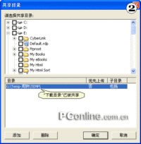 在PP点点通中共享文件非常简单,首先我们要设置一个或几个共享目录。在工具栏上点击“共享”图标,在打开的“共享文件”窗口中点击“目录共享”,在打开的对话框上,你设置的“下载目录”已被共享。这在里,你可以在上面的窗口中选择一个或多个目录共享(取消选择可以删除共享),也可以使用“添加”或“删除”按钮继续添加其它共享目录或删除已被共享的目录。共享目录设置完毕后,你可以把需要共享的文件复制到已共享的