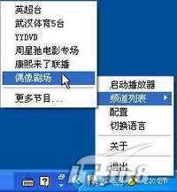 PPLive PPLive是一款用于互联网大规模视频直播P2P网络电视,运行PPLive后你会发现,软件并没有自己的主窗口,而是在任务栏区以图标形式出现(如图1)。PPLive的功能选项菜单均通过右键点击软件图标调用,菜单中提供“切换语言”、“配置”、“频道列表”、“启动播放器”等几项功能。点击“频道列表”中相应节目即开始连接,在缓冲完成后,自动调用外部默认播放器播放。 图1 P