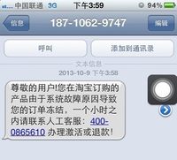 泡泡网手机频道10月18日 尊敬的用户:您好,您在某宝网购买的商品由于系统升级导致您的订单失效或被冻结,请于客服联系:(400-XXXX610)某宝网 网购的普及让妹子们不必穿着高跟鞋辛苦的逛街,就能买到自己中意的商品。不过逛某宝的不光有买东西的,还有骗子。最近就发现有一些打着某宝系统升级为借口的短信来忽悠用户。像开头中的那样。 骗子会通过短信诱骗用户与客服联系,还