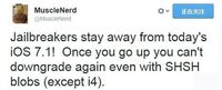 泡泡网手机频道3月11日 北京时间今天凌晨,苹果正式向用户推送了iOS7.1。新系统发布之后,evad3rs越狱团队重要成员越狱大神“肌肉男”就在推特上更新消息,称用户如果想要进行完美越狱,就不要升级iOS7.1,新系统已经封堵了此前越狱使用的漏洞,evasi0n7越狱工具已经不能使用。 而且这次苹果iOS7.1有了新变化,此前老用户更新系统之后还可以通过备份了SHSH文件将设备降级