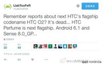 之前曾有消息说HTC明年的旗舰代号为O2,不过之后一直没有什么相关消息传出,现在看来基本是没戏了,而有网友的爆料也证实了这件事,HTC O2已经没有了,其明年的新旗舰将会是Perfume,预计搭载Android 6.1系统及Sense 8.0 UI。 手机代号的变动往往意味着机身的重新设计,难道这次HTC终于不再坚持被大家吐槽的“多下巴”设计了么?至于Android 6.1的问题,小版本的升