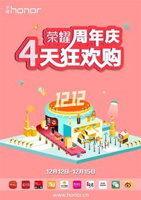 昨天荣耀的官方微博放出一张神秘的海报,虽然文字和图片的内容没有提到具体的信息,但留下了“期待在明天”这个悬念,让人倍感疑惑。适逢年末,在12月的节日无非就是双十二、圣诞节和元旦这三个,难倒荣耀有什么好日子不成? 果不其然,今天我们在昨天预告的时间点10:08继续保持关注荣耀官方微博,微博上再次更新了一张活动海报,宣布将在今年的”双十二”期间启动“荣耀周年庆、四天狂欢购”的超级大戏,史无前例地