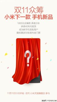 今天上午,小米公司官方微博放出了一条关于小米新手机的消息,消息称:“小米下一款手机全民众筹,50张发布会门票免费送”,并强调“这次我们玩把大的”,11月11日0点起,前往小米天猫旗舰店,支付1000元众筹款,产品定价后多退少补,每人限购一台。还保证新机有四大特点,并在40天内发货。 不管小米官方关于该机到底有哪四大特点以及是什么型号等信息并没有透露更多消息,联系40天内发货的承诺及最近有关于
