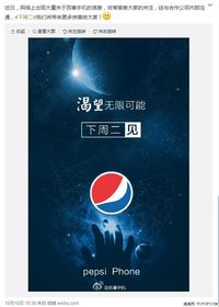 之前就有消息称百事将会进军手机行业,前日@百事手机 官方微博放出消息称:近日,网络上出现大量关于百事手机的信息,非常感谢大家的关注,经与合作公司内部沟通,下周二我们将带来更多惊喜给大家! 根据目前的消息,百事公司明显现今并不具备独立制造手机方面的技术及专业知识,所以应该是明智的选择了深圳玩疯科技有限公司作为代理以便在手机行业踏出自己的第一步。而该公司此前也曾代理过多个品牌。 就在昨天,微博