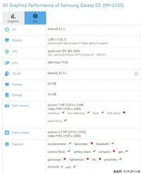 最近,三星连续发布了新机型Note 5和S6 edge+,没过多久现在又有新机被曝光了。但是这次不是高端的旗舰机型,而是一个新的系列,三星Galaxy O系列,首款机型Galaxy O5。该机配置在GFXBench数据库被曝光,编号为SM-G550。 由数据库给出的资料可以看出,该机搭载了32位四核1.3GHz的Exynos 3475处理器,跟之前入门级机型Galaxy J2相同。1GB运行