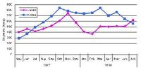 【泡泡网数字家电频道9月9日讯】据韩国调研机构Displaybank的数据显示,2008年7月日本等离子厂商的模板供货量再度超过韩国企业,而上次领先则是1年前的事情。日韩企业PDP模块近月来供货量走势图 据悉,等离子厂商今年7月的PDP模块总供应量比07年7月提升28.8%%,比08年6月提升3.1%%,总量达118.1万片。而同期日本企业占到了总数的47.7%%,达62.2万片;韩国企业