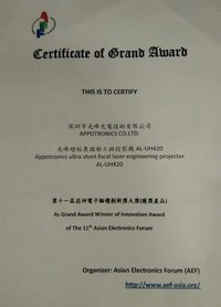 泡泡网摄影机频道10月8日 10月3-7日,第20届世界电子论坛及第11届亚洲电子论坛在台湾隆重举行,深圳市电子商会徐秘书长携深圳十余家会员企业参加了本届论坛,并参与了“亚洲电子产品创新大奖”的评奖,此次共有全球50家企业,上百件产品参评,光峰光电的超短焦激光投影机AL-UH420以评分第一名斩获了“亚洲电子产品创新大奖”的金奖。 光峰光电超短焦激光投影机AL-UH420获奖证书
