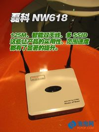 08年初,一款125M的小企业级无线路由器问世了,这款由磊科生产,型号为NW618的双天线无线路由器又带给用户很多惊喜,这是一款多功能的无线路由器产品,其双天线、多SSID部署、125M速率的优势显而易见,而据磊科透露,这款产品的价格应该在300-400元左右,价格上也存在较大优势。 现阶段,再发布802.11g的54M普通产品已经没有任何意义,这片市场已经饱和,而一款功能更丰富,适