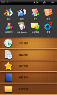 泡泡网电子书阅读器频道7月8日 彩读C66是纽曼推出的首款彩屏阅读器,价格不高,功能比较全面,受到了广泛关注。那么,彩读C66作为一款主打阅读的产品,其阅读功能如何。通过下面的文字,我们就来了解一下。 主界面 彩读C66的主界面采用了图标式功能指示的方式,音乐、视频、图片、PDF阅读等功能都以图标的方式显示在“桌面