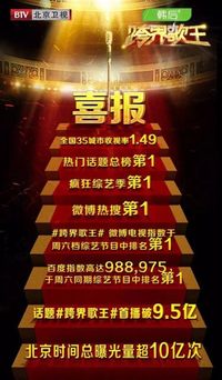 上周六晚,《跨界歌王》在北京卫视首播,王凯、刘涛、秦海璐、李光洁、潘粤明、巴图多位风格不同的影视明星惊艳开唱。最具新鲜感的跨界挑战,让观众看到影视明星的另一面。 《跨界歌王》首播就已引爆热门话题,全国35城市收视率1.49,在热门话题榜、微博搜索热度、都排名第一,话题#跨界歌王#首播破9.5亿,北京时间总曝光量超10亿,#跨界歌王#微博电视指数于周六档综艺节目中排名第一,百度指数高达