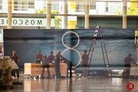 [泡泡网平板电脑频道] 根据美国部分网友的反映,随着 WWDC 大会的临近,苹果已经在莫斯康展览中心周边及内部布置了一些相关的元素。正如我们在截图当中看到的,几名工作人 员正在准备将一块印着数字“8”的巨大横幅 悬挂起来,这块横幅也证明了 iOS 8 将会是 2014 年 WWDC 大会的主题之一。 苹果在横幅的背景当中采用了海洋的元素,不过与 OS X Maverick