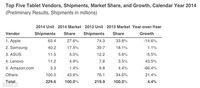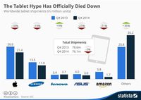 泡泡网平板电脑频道2月6日 根据IDC公司发布的全球平板出货量报告显示,2014年第四季度全球平板销量为7610万台,相比2013年第四季度的7860万台下滑了3.2%%。除了有个别品牌有所提升外,大部分品牌销量均出现下滑情况,难道平板市场真的开始要就此衰落了吗? 其中两个销量上涨的分别是联想集团和其他品牌。联想在收购IBM后国际声望大增,且它也是2014年除苹果外宣传力度最大的平板厂