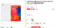 [泡泡网平板电脑频道] 三星GALAXY PRO系列平板电脑是三星在今年推出的新品,其中包括三个版本,尺寸分别为12.2英寸、10.1英寸和8.4英寸。其中的GALAXY Tab Pro T320尺寸最小,但是仍然拥有不俗的性能,从处理器到屏幕都非常高配,如今1号店仅卖2166元,是全网最低价,喜欢的朋友可以来看看。 三星GALAXY Tab PRO T320 1号店售价2166