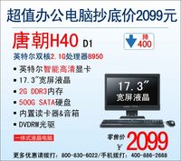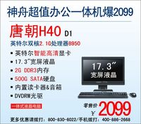 泡泡网一体电脑频道9月5日 高配置、高性能并不是所有电脑用户的需求,对于追求效益最大化的企业办公用户来说尤为如此,对于他们来讲,配置均衡实用、价格便宜实惠才是最为重要的两点。神舟唐朝H40 D1便是这样一款十分符合企业办公用户需求的产品。一体机的设计将17.3英寸宽屏液晶显示器与主机合二为一,为用户节省空间的同时,也避免了繁杂线缆的干扰;配置上,它搭载英特尔奔腾双核2.1G处理器B950,