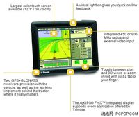 GPS系统是开放式的,交通只是它应用的一个方面,其实在农业方面GPS也有很广阔的应用前景。国外导航公司Trimble这对农民朋友的需要提出了一款新品,型号为AgGPS Fmx,它可以同时接收GPS和GLONASS两种信号,因此能达到更高的精确度,最高可以达到1英寸。 农业中,GPS也有很广泛的应用前景 AgGPS Fmx具有12英寸的宽大屏幕,与“体型”很高大的农业机械很搭配。另外