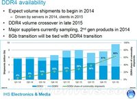泡泡网内存频道9月18日 DDR3算是内存史上相当长寿的一代,而且再坚持个两年多毫无问题。市调机构IHS预测称,DDR4内存要想成为市场主流,至少得2016年。 按照管理,一种内存规格只有出货量过半才能称得上占据主流地位,这包括桌面、笔记本、服务器等领域,但不包括平板机、智能手机和游戏机。 DDR4内存将在2014年开始批量出货,但在最初登场的一年半左右时间里,DD
