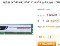 泡泡网内存频道2月24日 ● 产品型号:4GB DDR3 1333(CMV4GX3M1A1333C9) (报价 参数 图片 评论 ) ● 产品现价:129元 ● 购买链接:京东商城 ● 编辑点评:为全球强势的内存厂家之一,海盗船一直深受广大DIY玩家的关注。最近一款海盗船DDR3 1333 4GB内存在京东商城特价销售,价格仅为129元。相信其亲民化的价格,强悍的性能一上市就受到