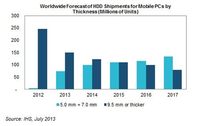 泡泡网硬盘频道7月24日 PC市场后继乏力,硬盘(机械硬盘)也明显慢了下来,唯有新出现的5毫米超薄型和此前低调存在的7毫米轻薄型值得期待,预计五年内的出货量将猛增超过25倍。 IHS iSuppli的数据显示,5/7毫米硬盘去年的合计出货量才区区500万部,今年将爆发增至74万部,未来几年速度会减缓但到了2017年,这一数字将达到133万部。西数、希捷、东芝三大厂商都正在这方