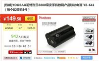 泡泡网移动电源频道10月8日 8800mAH电量对很多人手机来说足够用上3、4次,出差3天都足够,现在山寨横行的时代想买个便宜可靠的移动电源并不容易,小编今天推荐的移动电源是上了聚划算榜的,来自羽博,型号是烈日YB-641。 淘宝聚划算购买链接 产品如图所见 这款电池在天猫页面的售价是179元,聚划算一共上榜1天,价格150元还包邮,想买便宜可靠的玩家可要抓紧了