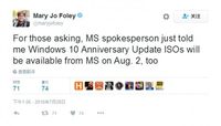 行业记者Mary Jo Foley近日在和微软发言人的交谈中明确了Windows 10在发布之后的相关细节。根据该记者的推文信息,微软将会在8月2日推出Windows 10周年更新ISO镜像,以便于用户进行重新安装和相关操作。 自今天开始,微软停止Windows 10的免费升级大餐,用户再想升级到正版Win 10,将回到熟悉的家庭版119美元、专业版199美元的“付费购买”模式.在此前公布的