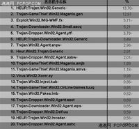 下表中的数据根据卡巴斯基产品检测情况统计得出。 网络流行病毒排名 下表中给出了中国地区2008年12月互联网上病毒的活跃情况。表中所列的都是最常遇到的恶意程序。这些恶意程序会在用户上网的同时给用户带来危害。 排名第一的恶意程序并没有一个具体的名称。这13.7%%的恶意程序都被启发式分析技术归类为特洛伊木马程序并被命名为:HEUR:Trojan.Win32.Generic。卡