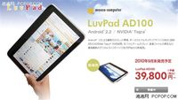 泡泡网上网本频道9月13日 据日本媒体日前透露,一款搭载Tegra 2处理器的平板电脑LuvPad AD100将于本月月底上市,售价39800日元(折合约3202元人民币)。 日系LuvPad AD100平板电脑(图片来源:互联网) 据悉,该款平板电脑配有10.1英寸(1024 × 600)电容式多点触控显示屏,搭载Tegra 2处理器,标配512MB内存及8GB闪存,运行