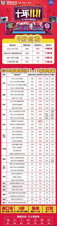 近日,国美在线双11全品类爆款名单遭到泄密,名单产品对比天猫、京东等电商平台,在大家电、3C、家居家具、母婴、食品等品类方面进行了全面对比,到底谁才是真正低,一张图Get,双11正式开抢! 从曝光的名单来看,部分商品比其他电商平台低了近千元。具体爆款名单如下