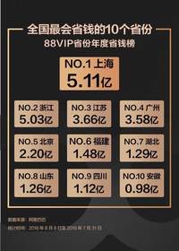 杨晓 · 2019-08-07 08:51 - 上海人最会省钱!阿里88VIP年度省钱榜单,上海5.11亿居榜首