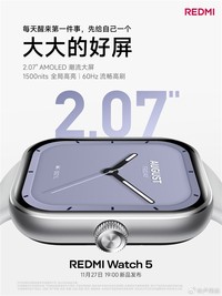 REDMI Watch 5将与K80系列一同亮相,官方今天公布了该款智能手表的详细屏幕参数。新品搭载了一块2.07英寸AMOLED大屏,屏幕尺寸在保持前代不变的情况下显著增加,屏占比达到了82%%。此外,REDMI Watch 5还引入了超窄四等边设计,边框仅有2.0mm,这使得整体视觉效果更加出色。