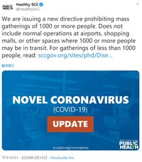 3月11日消息,美国圣克拉拉县的公共卫生部门颁布一项禁令,要求取消1000人以上聚集活动,该禁令则影响谷歌、苹果等科技公司。