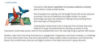 出版行业的创新是什么?创新就是增加读者好奇心的手段和工具,让读者对图书里面的内容产生兴趣从而想买来阅读。 在我们这个电视和数字时代,并不是所有的人都喜欢读书,但是很多大部头图书仍然销量不错。对于出版机构来说,新科技新技术可以提供讲故事的新方式。 往回看,图书经历了多个发展阶段:印刷的文字版,图画册,立体书,互动多媒体图书。现在是智能手机的时代,一切图书都受此影响。 读者需