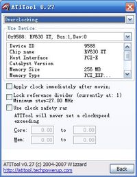 距离上次更新将近四个月后,ATI显卡超频利器ATITool再次升级,最新版本号为0.27 Beta 2。 ATITool 0.27能够支持HD 2600XT了 ATITool功能十分强大,但用户普遍反映对X1950/X1650系列显卡支持不力,对于新一代HD 2000系列更是无法兼容。现在的0.27版本不但能够支持所有A卡,而且增加了一项全新的监控功能,对于超频玩家来说非常实用! 支
