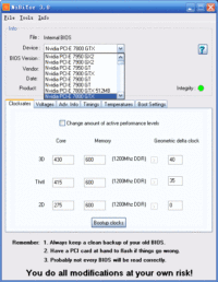 NiBiTor这款小软件是NVIDIA系列显卡最强大的BIOS编辑工具,随着NV最新7900GS和7950GT显卡的发布,NiBiTor升级到了最新的3.0版。 NiBiTor能够设定显卡2D/3D频率,支持部分显卡的核心电压调整(6800GS和7800GT),还可以设定显存参数,最常用的就是修改显卡风扇转速——这对于7600系列和7900系列都适用。 最新3.0版NiBiTo