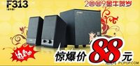 特惠体验,超值快乐购!奋达F313金牛贺岁版,成都活动惊爆价只售88元。F313是奋达目前最小的2.1产品,作为2009 贺岁产品,其最大特点就是性价比高,与在A10、A20、A30形成完整产品线,但是对市场来说,是一款不可多得的DIY装机精品。 F313外观设计风格吸取了欧美“简洁至上”的理念,其方方正正的外形,没有多余修饰,显得稳重大器。跟电脑配合看起来更是大方,舒适。