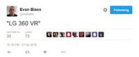 在2015年的时候就有传闻LG要推出VR设备,今天年美国著名科技媒体Venturebeat记者Evan Blass在国外社交网站Twitter上爆料了LG最新虚拟现实产品LG 360 VR。Evan Blass说:“LG 360 VR。”非常简短也没有图片,从中我们也看出什么LG VR的端倪。 有网友猜测LG推出的有可能是一款类似于谷歌Cardborad和三星Gear VR的虚拟眼镜