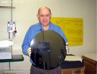 泡泡网主板频道2月20日 近期Intel宣布将投资50亿美元自今年年中在亚利桑纳州兴建Fab42工厂,这间工厂预计2013年完工,建成以后可生产基于300mm晶圆,以及基于14nm制程的芯片产品。虽然目前技术只能两场300mm晶圆,但是据Semico Research公司的分析,这间芯片厂不仅能生产300mm晶圆,还具备了生产基于450mm尺寸晶圆的能力。 450mm晶圆实物
