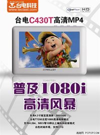 泡泡网MP3频道12月25日 台电科技作为国内MP4的知名厂家,其产品往往以个性、高性价比为消费者所称道。在圣诞节来临之际,台电最新推出了一款全新的产品——C430T。 C430T采用了白色ABS轻质机身设计,凸显简洁时尚。表面的磨砂处理为用户带来了更佳的操控手感。相对其同系列产品C430,C430T采用统宝LTPS高分屏幕(分辨率为800×480),容量也升级为8GB。出色的屏