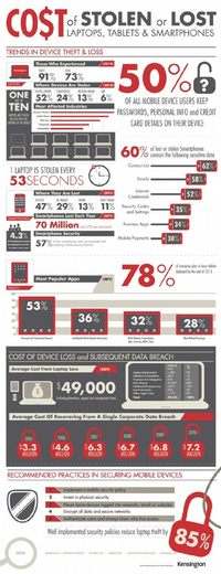 泡泡网电源频道2月17日 丢失过手提电脑吗?丢失过智能手机吗?你知道吗?十分之一的手提电脑最终都会被盗,有点不可思议吧?丢失的代价有多大?以下就是来自反偷窃设备制造公司Kensington公司的信息图。 2010年,有91%的人手提电脑是被盗的,73%的是自己遗失的,每53秒就有一台手提电脑被盗。被盗高发区是办公室,为52%;接下来是讨论会或招待会等重大会议中,为24%,;然后是