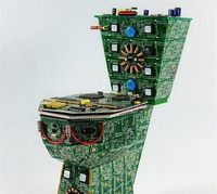 泡泡网散热器频道2月10日 美国一名艺术家日前找到一种旧电脑废物利用的新方式,那就是用报废的电脑元件制作成胸罩、马桶、高跟鞋等。来自美国新泽西州的雕刻艺术家史蒂文·罗德里格(Steven Rodrig)花费一年时间打磨自己的技巧,利用切割机、锯、刀、锉等手工工具将密密麻麻的绿色线路板分解重装。 他目前已经创造出许多模型,从蜘蛛、苍蝇、乌龟再到马桶、高跟鞋,甚至还有胸罩以及