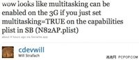 泡泡网手机频道4月12日 我们都已经知道苹果官方对外声称iPhone 3G就算升级到OS4也不会支持多任务。因此我们悲观的以为只能靠第三方的自制固件来让人iPhone 3G也支持这一功能了。 但没想到事情远没有我们想的这么糟,其实让iPhone 3G也支持多任务只需要简单设置即可。一位国外的网友在Twitter中写道:“哇,只需要在功能列表设置multitasking=TRU