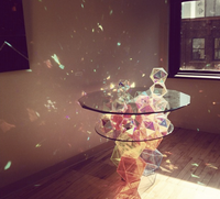 [泡泡网 前沿电子频道] 缤纷的色彩想必谁都喜欢,小的时候很多小孩都喜欢用三菱镜把阳光分解出现七彩光,才知道原来无色的光透过是折射会变成这么美的!现在这款Sparkle Palace Cocktail Table肯定可以当你得到更绚丽的色彩,它可以将阳光折射成七彩光芒的玻璃桌。 这个桌子分成两部份, 中心主要支架是以压克力材质切割成大大小小不同尺寸的几何水晶球体,再与平面玻璃