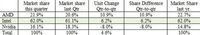 泡泡网显卡频道8月15日 市场调研公司JPR刚刚公布了2013年Q2季度全球显卡芯片出货量及市场份额报告,AMD成为当季赢家,出货量增长了10.9%,Intel的出货量也呈增长态势,提升了6.2%,NVIDIA的出货量则下降了8%。 2013年Q2季度显卡芯片市场份额 AMD在当季出货量增长10.9%,份额从上季度的20.6%提高到21.9%,相比去年的22.7%有所下降。