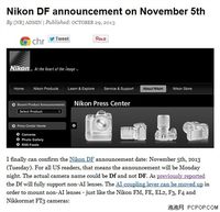 泡泡网数码相机频道10月30日 来自国外nikonrumors网站最新消息称,尼康DF将于11月5日在美国发布,而且这一发布日期和之前的传闻消息完全吻合,因此我觉得可靠性非常高。 nikonrumors网站截屏 较早前的传闻中曾说尼康DF将推出黑色和黑银色两个版本,单机售价约为3000美元(折合人民币元约18248元),搭配50mm 1.8G镜头套机售价约为3300美元(折