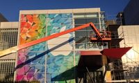 泡泡网平板电脑频道10月20日 旧金山芳草地艺术中心( Yuerba Buena Center for the Arts )已经完成了装饰,苹果于下周二在这里举行iPad新品发布会。 目前,建筑正面的玻璃已经装饰成五彩斑斓的苹果叶子,就像发布会的邀请函一样。除了五彩苹果叶子,中间是白色的苹果logo。 传言称苹果将在22日的发布会上推出全新设计的iPad 5以及配备Re
