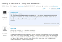 泡泡网平板电脑频道9月27日 iOS 7系统除了扁平化及200多项新功能外,最近似乎又有了另一个新功能——令人呕吐。 近日,有果粉在苹果官方论坛发帖称,长时间使用iOS 7,大量的3D效果让自己出现了强烈的恶心、头晕现象。这位果粉表示,阅读iOS 7的屏幕就犹如在汽车中看书一样。这个帖子的回复目前已经超过8页,回复者都表示跟发帖者有同样感受。 虽然在iOS 7的辅助功能中,