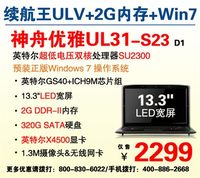 [poparticle_page=13吋长续航小本!神舟UL31-S23仅2299(005500045,00258,000269078,1)] 泡泡网笔记本频道10月28日 选笔记本,既要宽屏、强劲,又要轻薄便携?神舟13.3吋LED宽屏超低电压双核本优雅UL31-S23让这一切成为可能!这款13.3吋小本采用英特尔超低电压双核处理器SU2300,搭载X4500显卡、2G内存和锂离子聚合