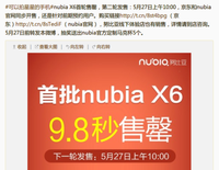 泡泡网手机频道5月20日 来自努比亚的最新消息,今日首次发售的nubia X6,上市即遭哄抢,仅用时9.8秒,首批即被抢购一空,可见该机火爆程度。小编从nubia官方微博了解到,第二轮发售的相关信息:5月27日上午10:00,nubia官网同步开售,还是针对前期预约用户。 >>nubia X6预约地址:[京东商城][努比亚官网] 以下为产品信息回顾,如果你已经比较了解,就不用看