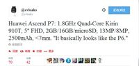 泡泡网手机频道4月26日 继外观设计被曝光之后,爆料大神evleaks在推特上公布了华为Ascend P7的硬件参数。据悉该机采用了的Kirin 910T四核处理器,主频为1.8GHz;5.0英寸屏幕1080P屏幕;系统运行内存为2GB,手机存储则为16GB(PS:应该配有其他容量版本),支持存储卡拓展;前置摄像头800万像素,后置摄像头1300万像素;电池容量2500mAh;机身厚度小于7毫