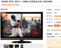 泡泡网液晶电视频道5月16日 ● 产品型号:夏普 LCD-46G100A (报价 参数 图片 评论 ) ● 产品现价:4699元 ● 购买链接:新蛋网 ● 编辑点评:LCD-46G100A是夏普老款46英寸全高清液晶电视。它采用CCFL背光的ASV原装液晶面板,支持24p影院模式,配备SRS TruSurround XT环绕音箱,外观设计经典大气,目前新蛋网仅售4699元。